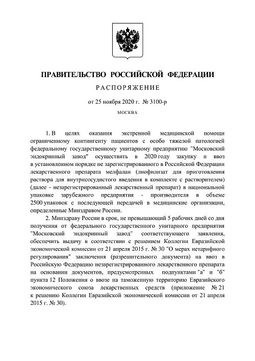 ФГУП «Московский эндокринный завод» уполномочен осуществить закупку, ввоз и доставку лекарственного препарата «Мелфалан»